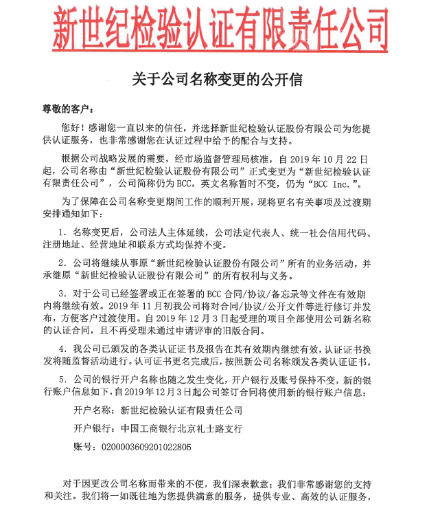 根據(jù)公司戰(zhàn)略發(fā)展的需要,經(jīng)市場(chǎng)監(jiān)督管理局核準(zhǔn),自2019年10月22日起,公司名稱(chēng)由“新世紀(jì)檢驗(yàn)認(rèn)證股份有限公司”正式變更為“新世紀(jì)檢驗(yàn)認(rèn)證有限責(zé)任公司”,公司簡(jiǎn)稱(chēng)仍為BCC,英文名稱(chēng)暫時(shí)不變,仍為“BCC Inc.”。