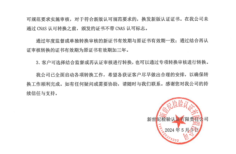 2.2024年6月1日起,我公司不再實(shí)施基于舊版認(rèn)可規(guī)范的審核,開始按照新版認(rèn)可規(guī)范要求實(shí)施審核,對(duì)于符合新版認(rèn)可規(guī)范要求的,換發(fā)新版認(rèn)證證書。在我公司未通過(guò)CNAS認(rèn)可轉(zhuǎn)換之前,頒發(fā)的證書不帶CNAS認(rèn)可標(biāo)志。