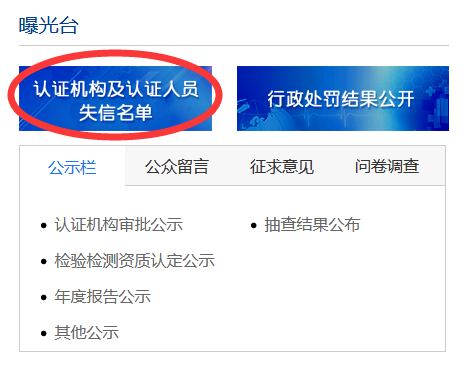 機(jī)構(gòu)曝光情況也參見國(guó)家認(rèn)證認(rèn)可委員會(huì)網(wǎng)站,如下圖: