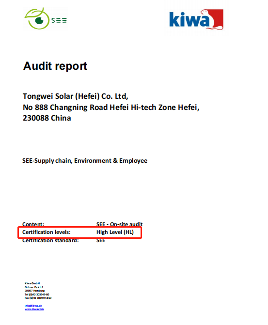 作為全球認(rèn)證領(lǐng)域20強(qiáng)企業(yè),Kiwa集團(tuán)專(zhuān)家與Kiwa BCC專(zhuān)家對(duì)企業(yè)進(jìn)行了現(xiàn)場(chǎng)審核、通過(guò)員工訪(fǎng)談,以及文件評(píng)審等工作,最終為通威太陽(yáng)能頒發(fā)了首份依據(jù)SEE標(biāo)準(zhǔn)的ESG現(xiàn)場(chǎng)評(píng)估報(bào)告,并高度評(píng)價(jià)了通威太陽(yáng)能在ESG管理方面的突出表現(xiàn)。報(bào)告涵蓋可持續(xù)的企業(yè)治理、供應(yīng)鏈管理、員工權(quán)益、環(huán)境管理四個(gè)部分,總計(jì)約50個(gè)主題,在全球范圍內(nèi)有著較高且廣泛的客戶(hù)接受度和權(quán)威公信力。
